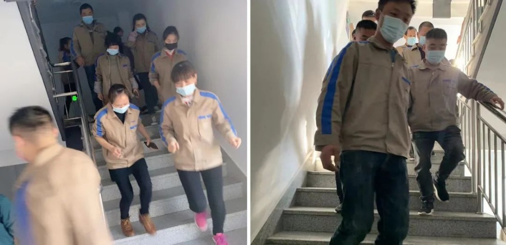 隨著警報響起,應急疏散演練正式開始,班組長在各車間門口引導員工迅速離開車間,員工用濕毛巾之類物品捂住口鼻彎腰低姿快速有序地沿防火安全疏散通道向外跑,各部門負責人將員工引導至空曠安全地帶“緊急集合點”,隨即各車間主任清點人數,并層層向上匯報。