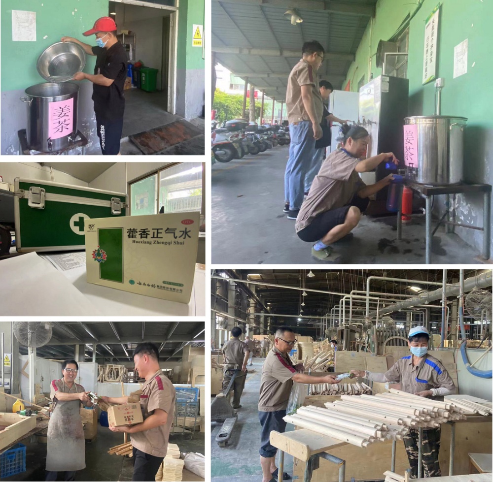 公司在每個車間辦公室配備防暑藥品,食堂工作人員準備了姜茶,并且還在下午適時發放棒冰。